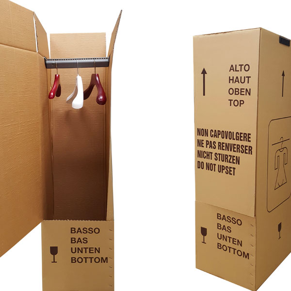 Scatole e bauletti per la spedizione di capi appesi, pratici e sicuri, con sistema brevettato e pronta consegna nei nostri magazzini.