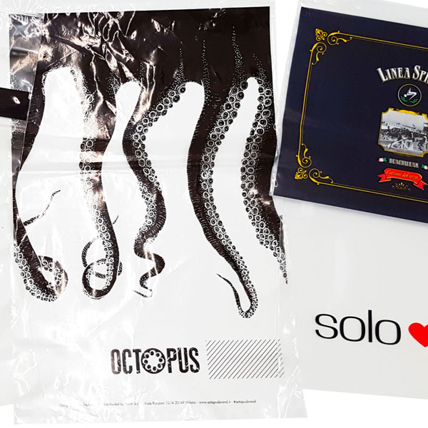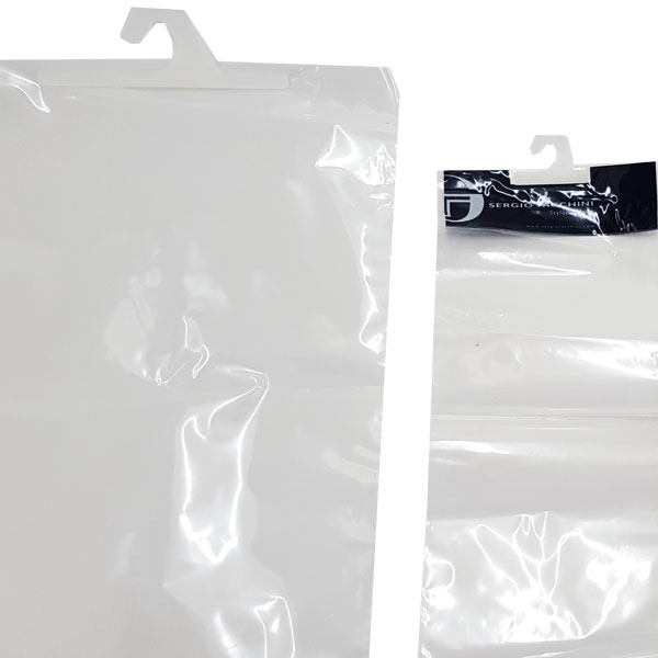 Buste in polietilene o polipropilene con ganci in plastica, personalizzabili con stampa fino a 4 colori, resistenti e di prima qualità.