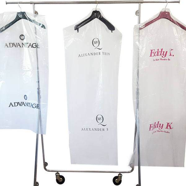 Copriabiti per capi appesi, sciolti o in bobina presaldata, disponibili neutri o personalizzati con logo per lavanderie e aziende moda.