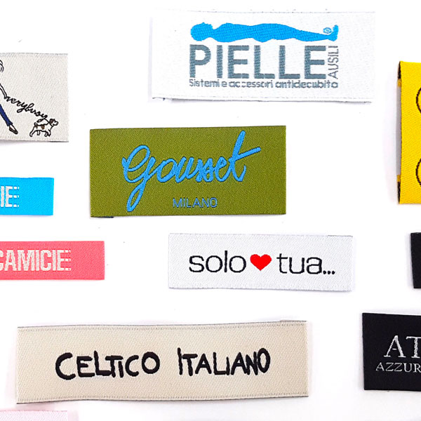 Etichette in raso, rasetto, taffetà o alta definizione, tagliate, piegate o fustellate, stampate su poliestere o raso, adesive o in PVC, per ogni esigenza.